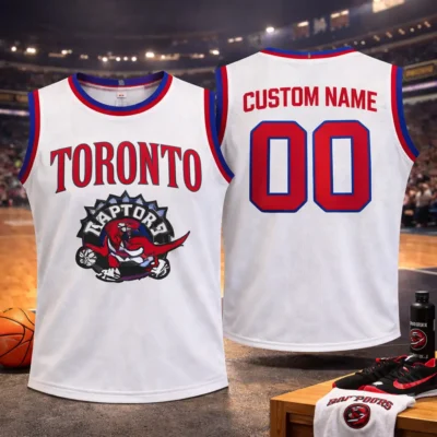 Show your Toronto Raptors pride with this custom white basketball jersey featuring your chosen name and number on the back. The front design highlights classic Toronto team styling with a vintage-inspired Raptors logo, while the red and purple accents add bold contrast. A great option for fan collections, sports events, everyday wear, or gifting.